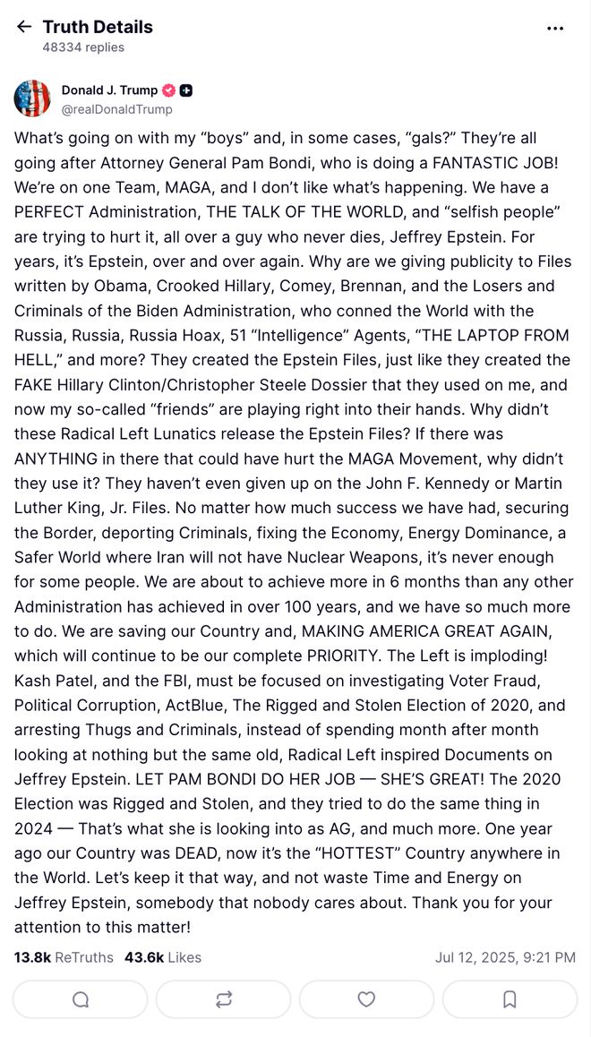 邦迪因此成为信任危机的中心人物。作为特朗普任命的司法部长,她原本因“忠诚”被保守派赋予高度期待,尤其在特朗普曾承诺“彻底公布爱泼斯坦档案”的背景下。但此次备忘录内容的保守、模糊乃至删节,令她在核心支持者中声誉崩塌,甚至有人要求她辞职。特别是MAGA运动阵营认为,她代表的不是揭露真相的斗士,而是“系统合谋”的象征。