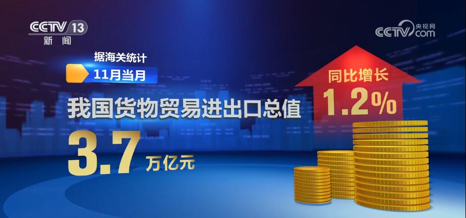 海关总署今天(12月7日)对外公布,今年11月份,我国货物贸易进出口总值3.7万亿元,同比增长1.2%。数据显示,我国外贸稳中向好态势进一步巩固。