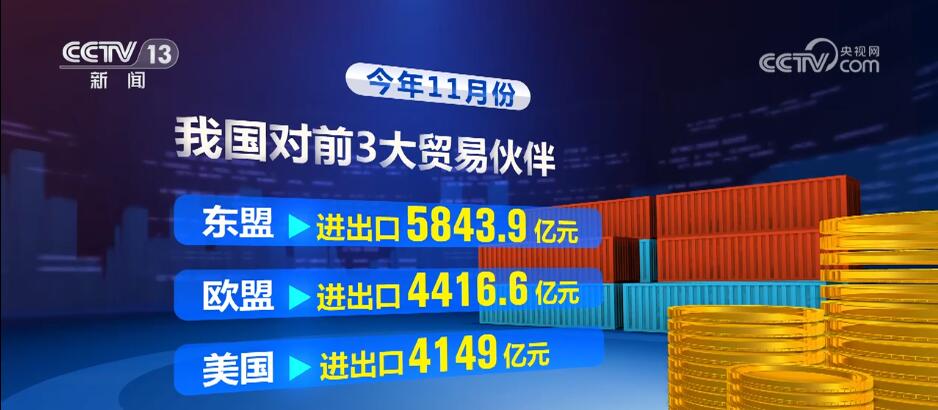 海关统计数据显示,今年11月份,我国对前3大贸易伙伴东盟、欧盟、美国分别进出口5843.9亿元、4416.6亿元、4149亿元,合计占我国进出口总值的38.9%;对共建“一带一路”国家进出口1.72万亿元。同期,我国与拉美、非洲、中亚五国进出口延续良好态势,分别增长9.3%、8.4%、43%。
