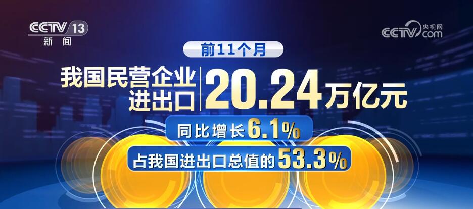 前11个月,我国民营企业进出口20.24万亿元,同比增长6.1%,占我国进出口总值的53.3%,提升3.1个百分点。同期,上海、江苏、浙江、安徽等长三角区域合计进出口13.87万亿元,同比增长0.6%,其中出口同比增长1%,拉动同期我国出口增长0.4个百分点,强劲活跃的增长极功能不断巩固提升。